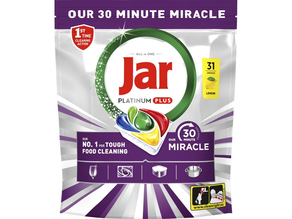 Jar Platinum Plus 30 Minute Miracle kapsle do myčky odstraní zaschlé zbytky už za 30 minut. Pětinásobná síla, lesk a svěží citronová vůně.Odstraňuje zašedlost, která vzniká postupem času.Jar spojuje v jedné účinné kapsli tekutý i práškový prostředek na mytí nádobí.Vysoce rozpustný obal se rychle rozpouští a funguje dobře i při krátkých cyklech, takže nádobí se začíná ihned umývat.