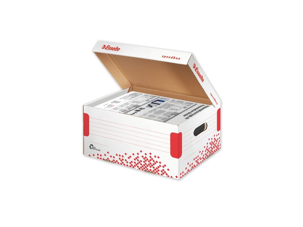 Papírový kontejner s víkem pro uložení dokumentů a pořadačů sloužící k archivaci. Skvěle se hodí také pro přenos většího množství dokumentů a dalších potřebných předmětů ke schůzkám a prezentacím. Vyrobeno ze 100% recyklovatelné vlnité lepenky. Hřbetní otvor pro snadné uchopení je na delší i kratší straně, což umožňuje dva způsoby uložení podle výšky police. V barvách značky Esselte.