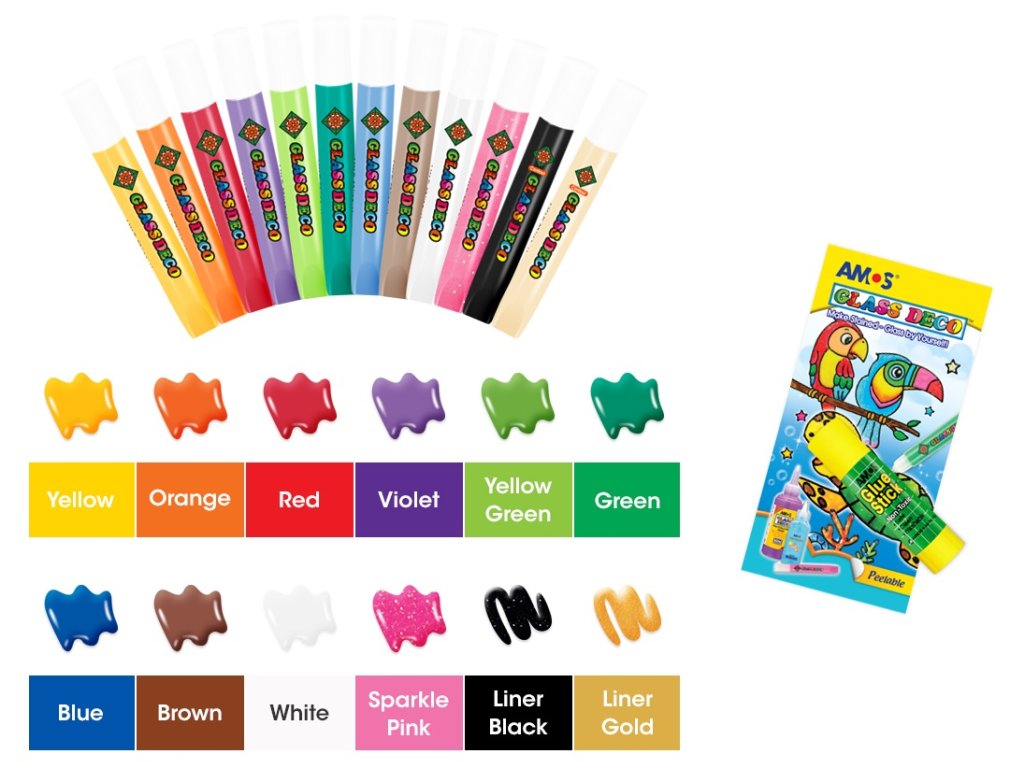 - 12 barev na sklo (10,5 ml): žlutá, oranžová, červená, fialová, světle zelená, zelená, modrá, hnědá, bílá