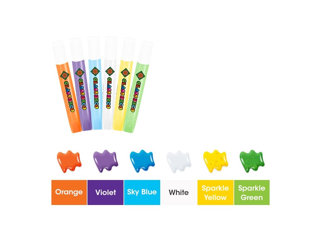 - 4 ks barev na sklo (10,5 ml): oranžová, fialová, svetlě modrá, bílá.