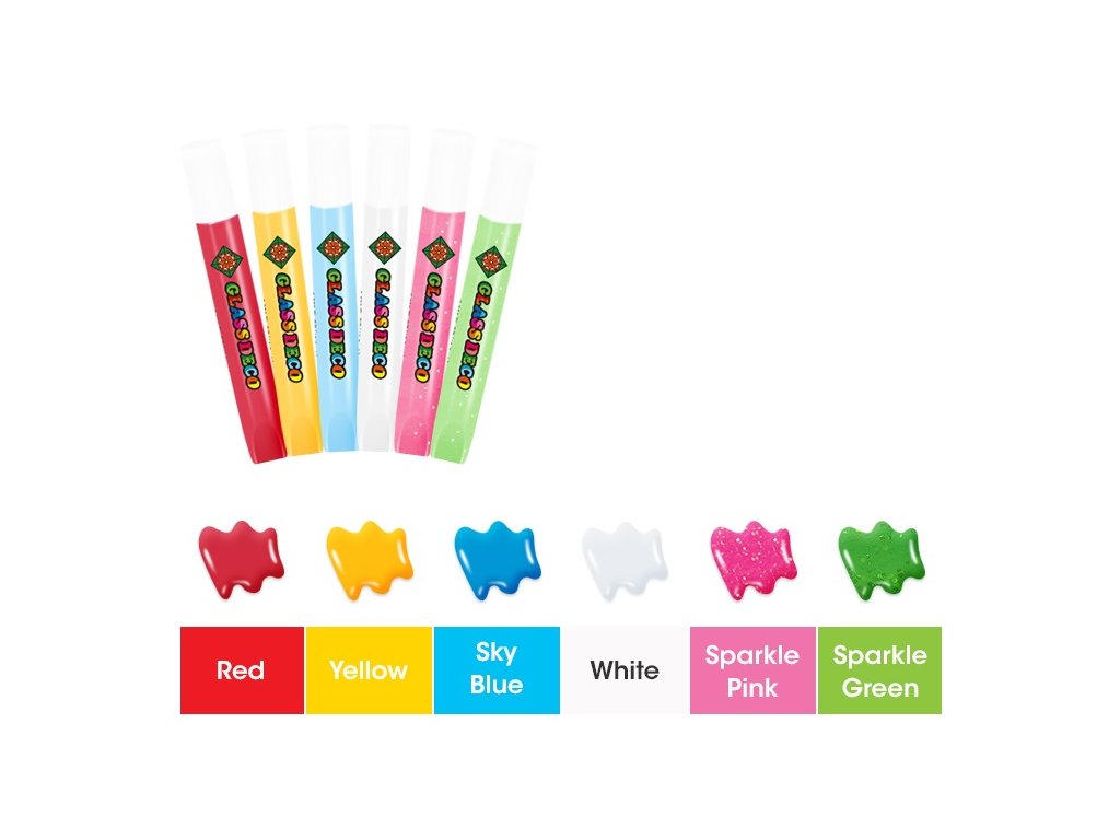 - 4 ks barev na sklo (10,5 ml): červená, žlutá, světle modrá, bílá.