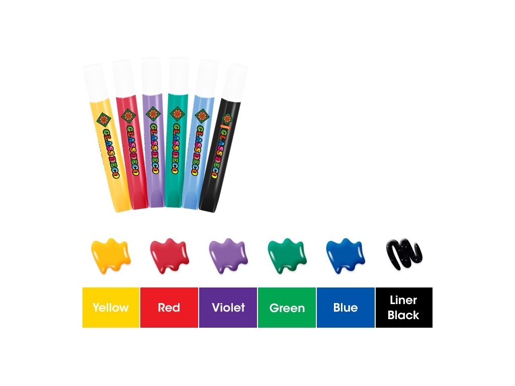 - 6 barev na sklo (10,5 ml): žlutá, červená, fialová, zelená, modrá