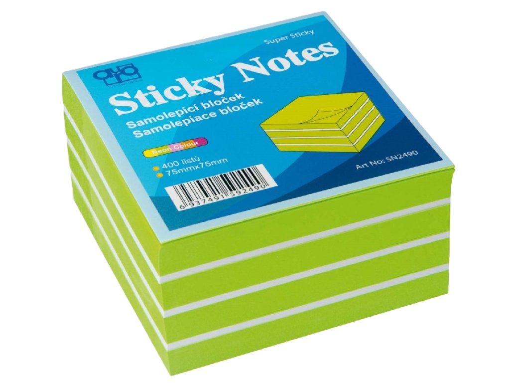Samolepicí bloček 75x75mm, 400 listů,barva zelená+bílá, opatřeny kvalitním lepidlem, po odlepení nezanechává žádné stopy, baleny ve fólii, gramáž 80g/m2.