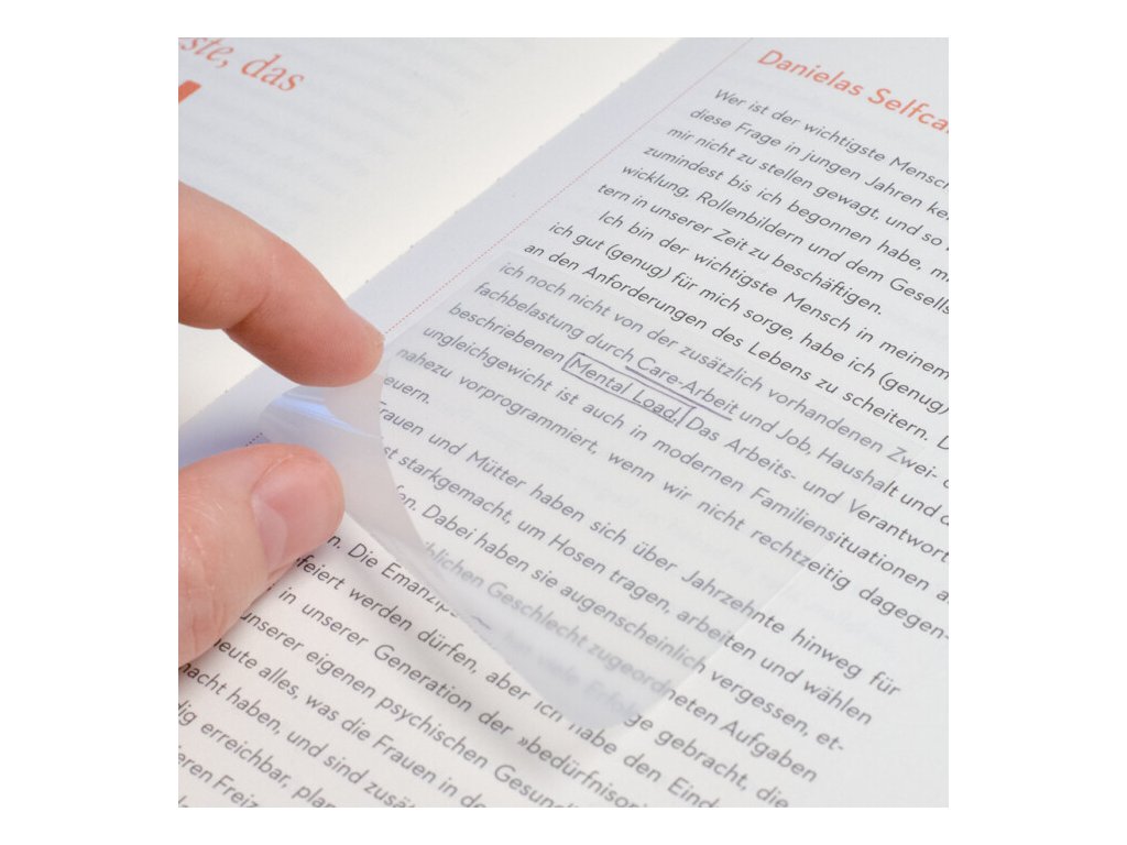 - Transparentní – pište přímo na tištěný text či obrázky bez zakrytí nebo poškození originálního obsahu.