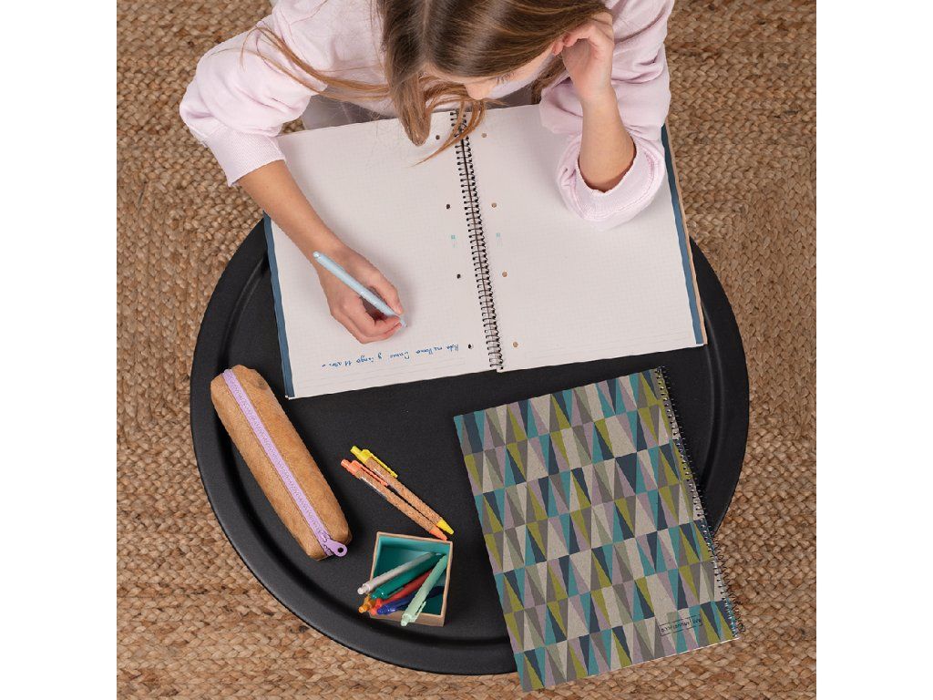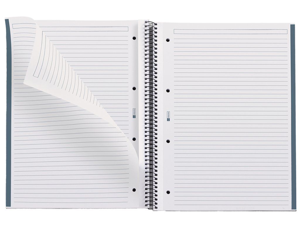 Ekologicky šetrný blok s pevnou obálkou vyrobenou ze 100 % recyklovaného kartonu. Kvalitní, neprůhledný papír odolá tlaku pryže a umožňuje oboustranné psaní bez prosakování či rozmazávání inkoustu. Vyrábí se z udržitelných vláken, a proto je šetrný k životnímu prostředí. Mikroperforace a děrování pro snadnou manipulaci a rychlou archivaci listů. Předtištěné záhlaví a barevné sekce pro organizaci poznámek. Pružná hliníková spirála pro snadné a pohodlné listování o 360 °. Systém Coil-lock zamezuje zachytávání o jiné sešity, batoh nebo oblečení.