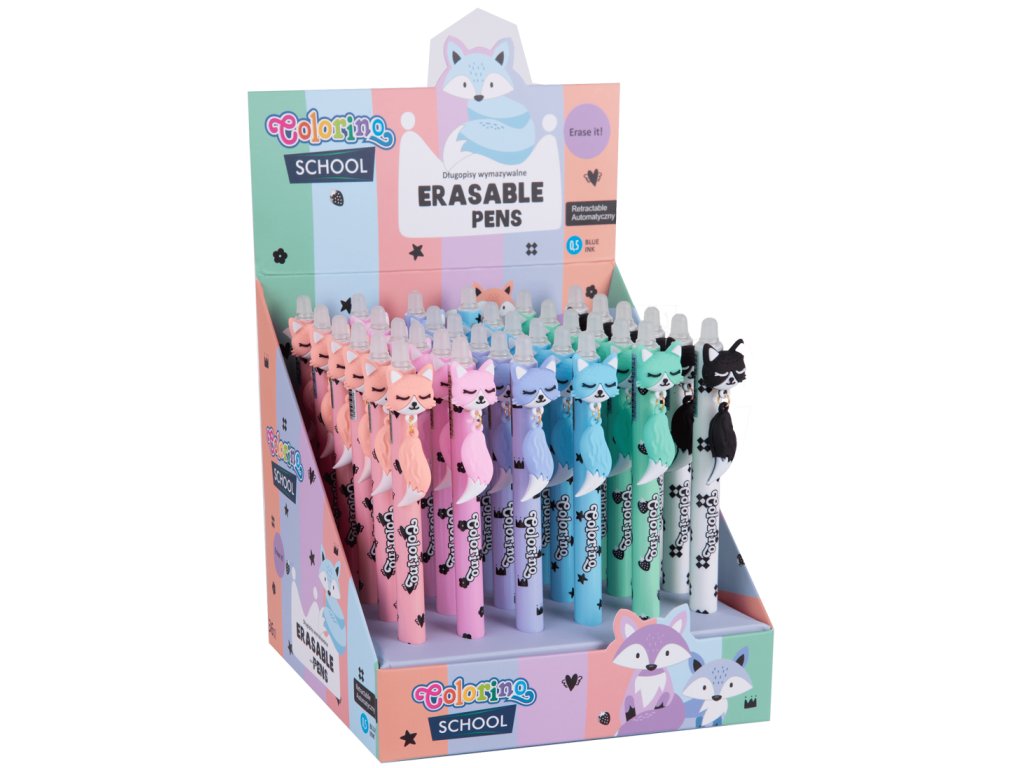 Gumovatelné pero s motivem lišky, doplněné o ocásek, který se zlehka pohupuje do rytmu tvého psaní. Transparentní koncovka pro snadné gumovaní, stiskací mechanika ukrytá v hlavě lišky. Hladké tělo s jemným potiskem, které ladí s celým perem. Balení obsahuje 36 ks/displej,6 motivů.