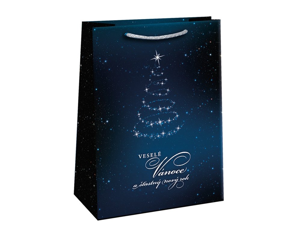 Lesklá vánoční papírová dárková taška s originálním designem s českým textem.