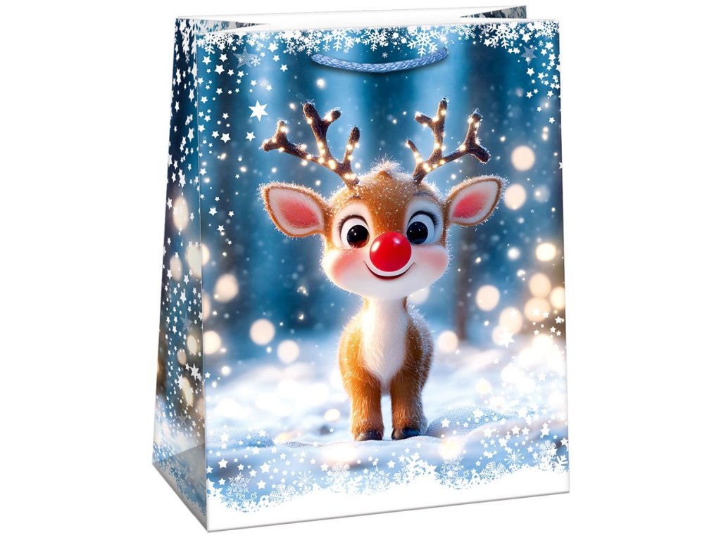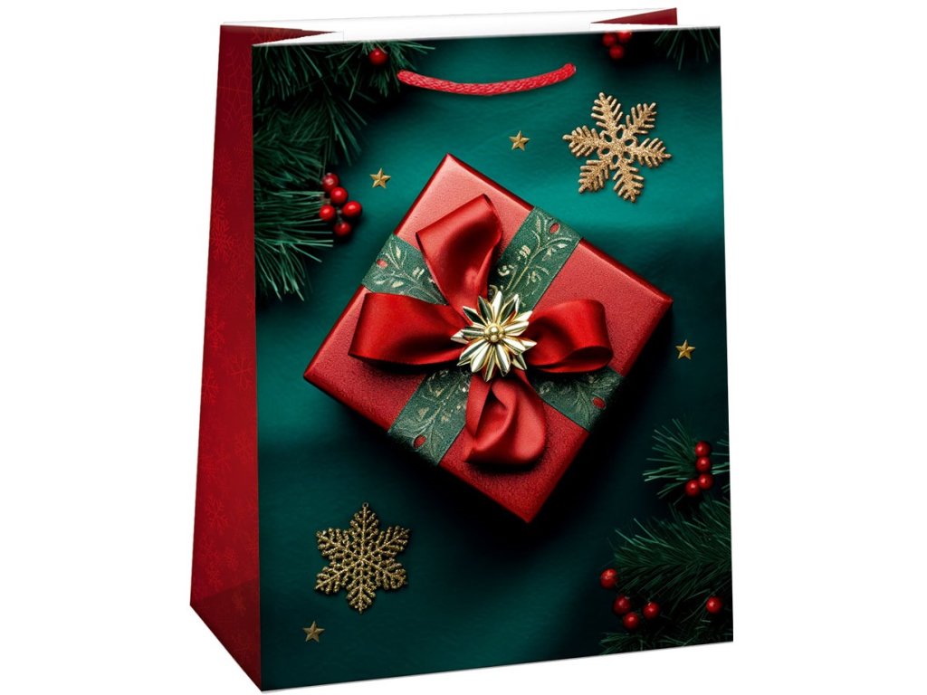 Lesklá vánoční papírová dárková taška s originálním designem.