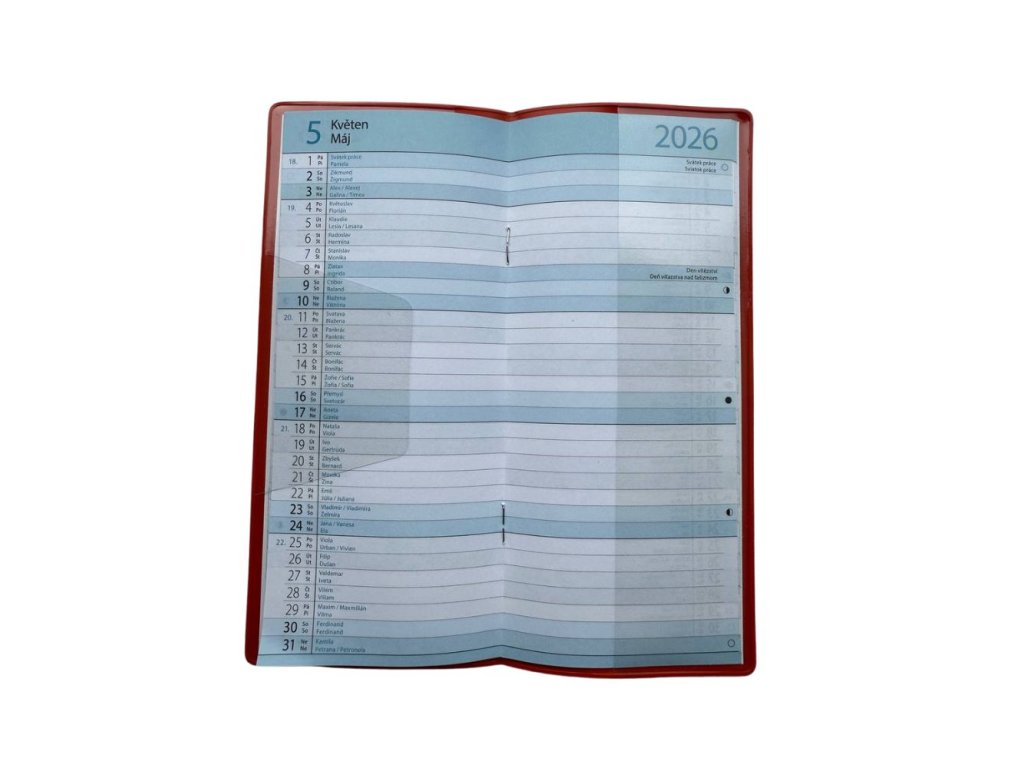 Kompaktní měsíční diář v odolném PVC obalu, ideální do tašky či kabelky. Obsahuje 32 stran s měsíčním kalendáriem od prosince 2025 do ledna 2027. Nabízí dopolední a odpolední hodinové plánování, čísla týdnů, přehled českých křestních jmen a státních svátků. Praktický nástroj pro efektivní organizaci času.