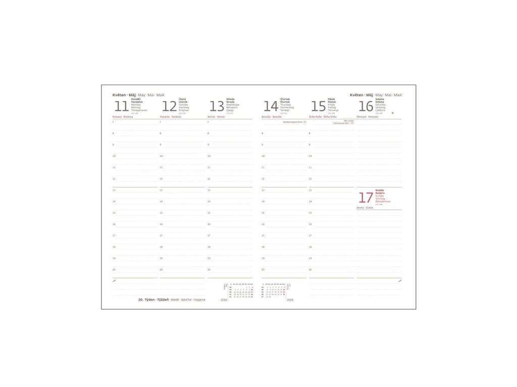 Diář je vybaven sekcí pro osobní údaje, plánovacím kalendářem na rok 2026, přehledným kalendářem na roky 2026/2027, seznam svátků, mezinárodní telefonní předvolby, a také prostor pro vaše poznámky a plánovač dovolené. Kalendárium nabízí jména a státní svátky v češtině a slovenštině, dny a měsíce v pěti jazycích (čeština, slovenština, němčina, angličtina, ruština), počet dnů od začátku do konce roku, měsíční fáze. Design je doplněn kulatými rohy a perforací pro snadné odtrhávání stránek. Tento diář je ideální pro každodenní organizaci a plánování jak v profesním, tak v osobním životě, spojující funkčnost s estetikou.