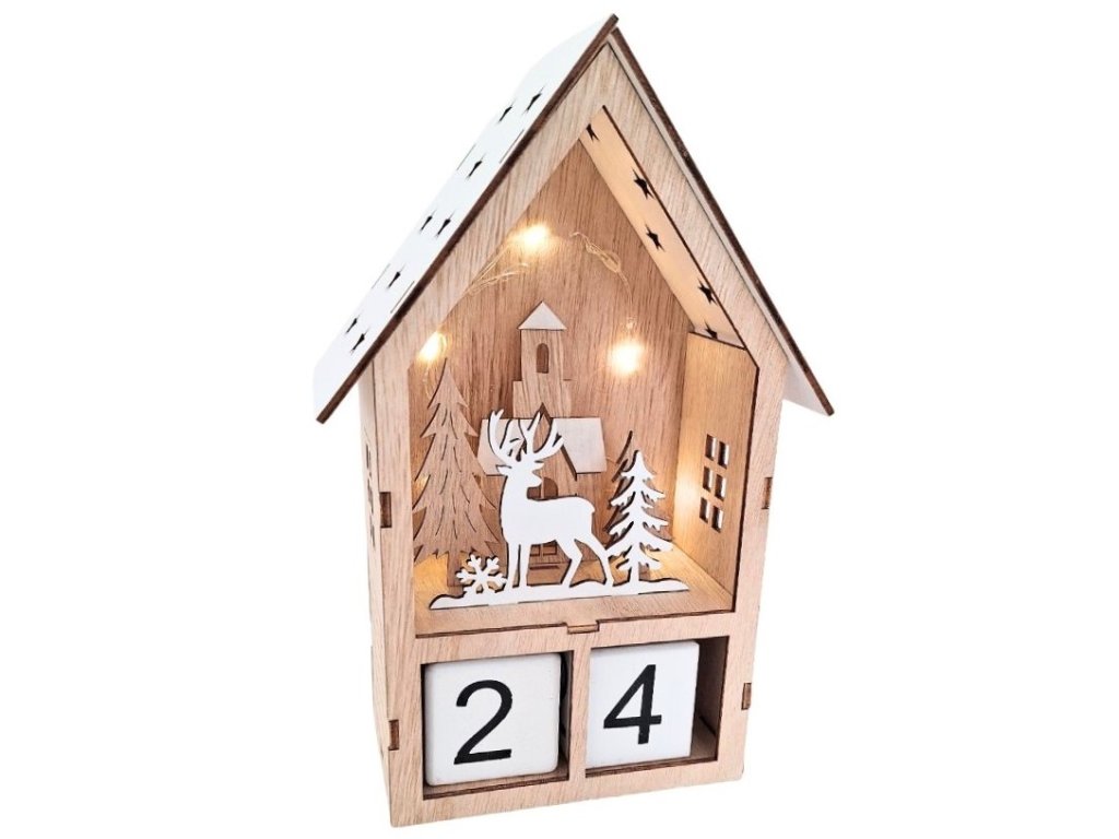 Dřevěný adventní kalendář domeček se sobem a s LED 15 x 23 x 8 cm
