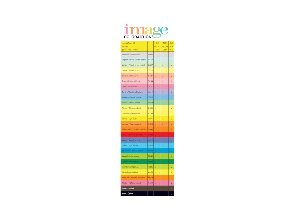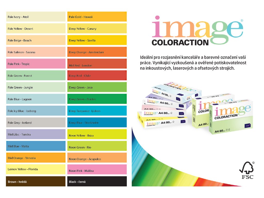 Image Coloraction je bezdřevý barevný papír s elegantním povrchem. K dispozici je ve dvou gramážích 80 a 160 g/m² a v široké škále barev intenzivních, pastelových a reflexních odstínů. Papír se vyznačuje minimální prašností a rovnoměrným rozvrstvením vláken a barevných pigmentů. Je určen pro potřeby externí a interní komunikace jako např.: prezentace, brožury, letáky, komplimentky, vizitky a záložky.
