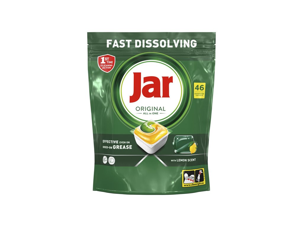 Tablety do myček nádobí Jar All in One pomáhají odstranit i zaschlou mastnotu. Jsou vhodné i pro použití v profesionálních myčkách nádobí s krátkým cyklem mytí (1-5 min). Rozpouštějí se 2x rychleji než běžné pevné tablety. Povrchově aktivní látky zajistí dokonalé odstranění zbytků jídel a mastnoty z nádobí a jejich uzamčení ve vodě, což zabraňuje jejich opětovnému usazování na příborech, talířích a skle. Vhodné i pro myčky skla. Účinné při všech stupních tvrdosti vody.