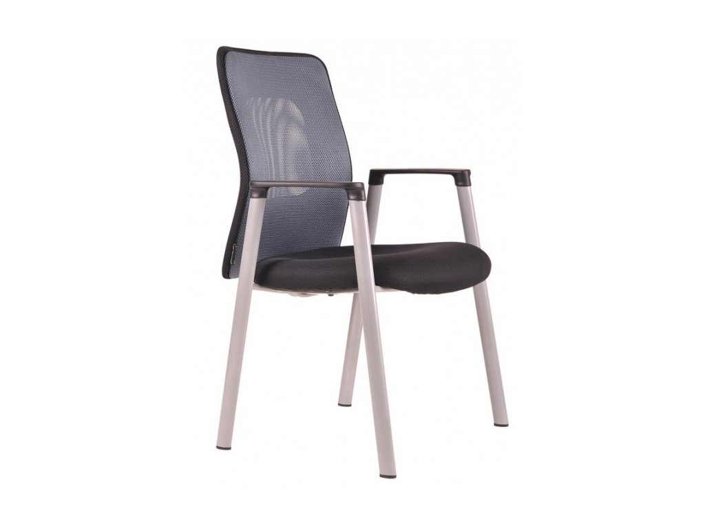 Pohodlná konferenční židle s pevnou konstrukcí v šedé barvě. Ergonomicky tvarovaný síťovaný opěrák navádí ke správnému sezení, a zajišťuje celodenní větrání zad. Pohodlný černý sedák s pěnovou výplní zajistí maximální pohodlí i při dlouých jednáních. Plastové područky zafixují ruce ve správné poloze.