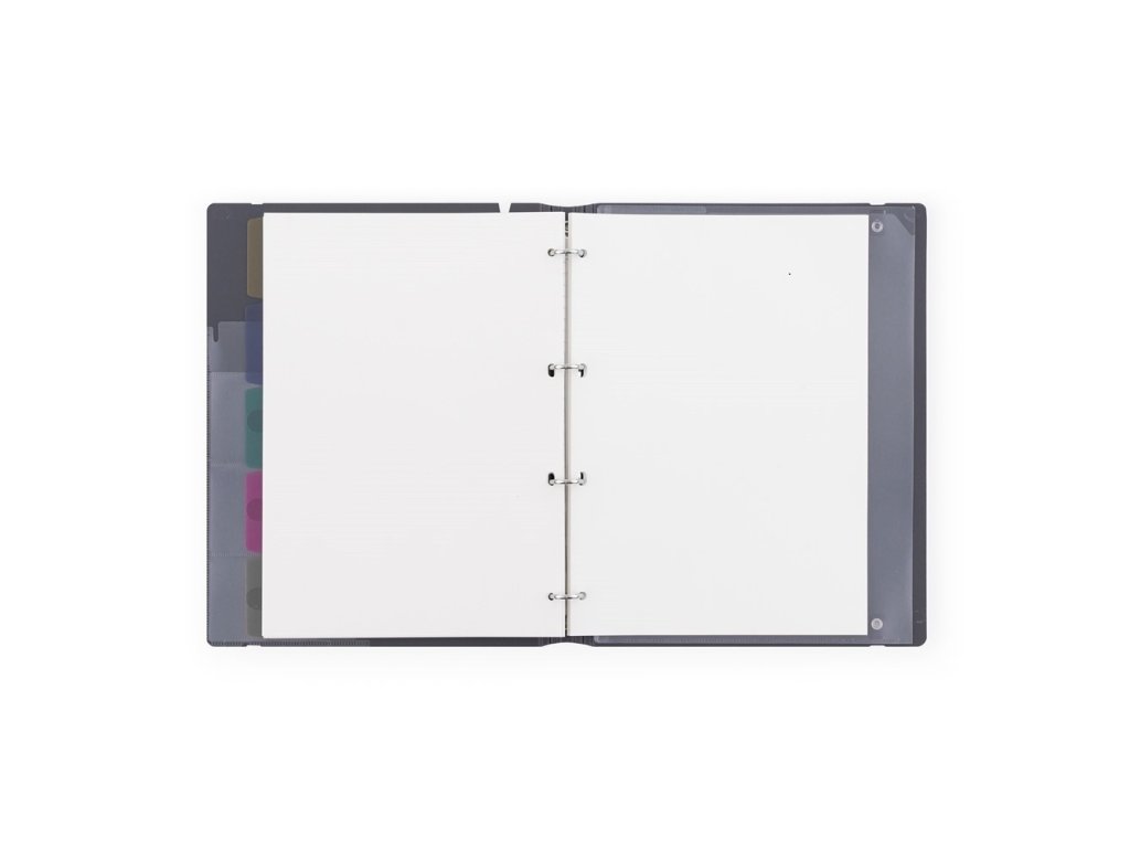 Tento blok nabízí praktické rozřaďovače a vnitřní náplň: 30 stran linka, 30 stran tečka, 30 stran čisté, bez potisku. S uzavíráním na elastickou gumičku a kapsami pro vizitky. Čtyřkroužkový mechanismus umožňuje snadné přidávání nebo vyjímání listů.Buďte první, kdo napíše příspěvek k této položce.