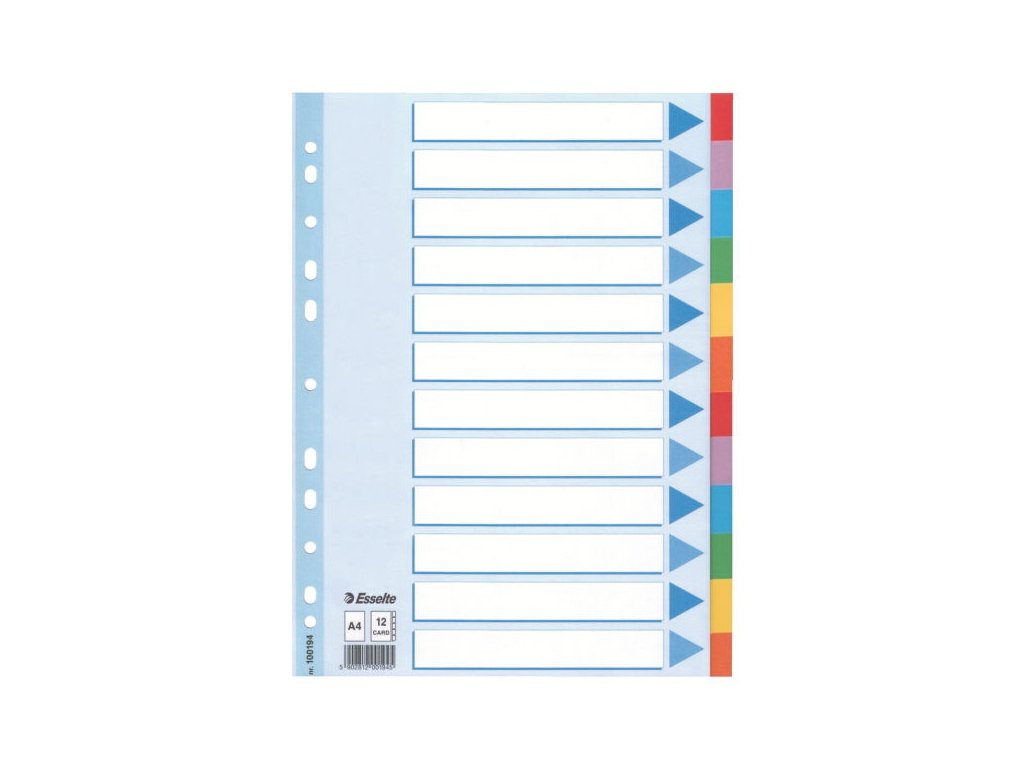 Rozlišovače ze silného recyklovaného kartonu pro třídění dokumentů v pořadačích či deskách do formátu A4 s popisovatelnou titulní stranou. Jednotlivé stránky v různých barvách. Zesílená multiperforace plastovým proužkem na titulní straně. 12 barevných rozlišovacích listů pro rychlou orientaci v obsahu. Univerzální multiperforace (11 děr) pro založení do pákového i kroužkového pořadače.Doplňkové parametry