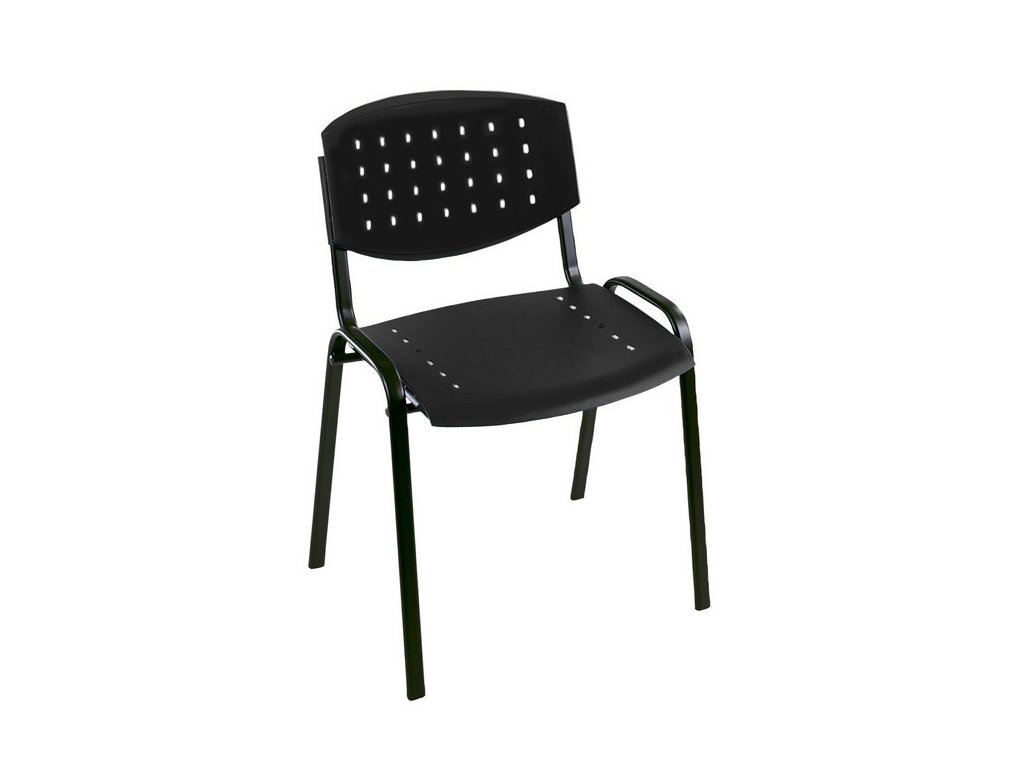 Moderní jednací židle s černě lakovaným ocelovým rámem oválného profilu a plastovým sedákem, vhodná do každé kanceláře či konferenční místnosti. Sedák i opěrák jsou vyrobeny z černého penvého plastu s děrovaným designem. Maximální stohovatelnost je 10 kusů. Cena bez područek.