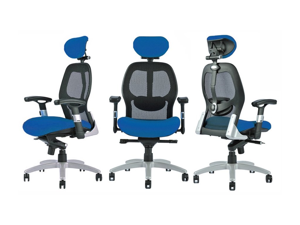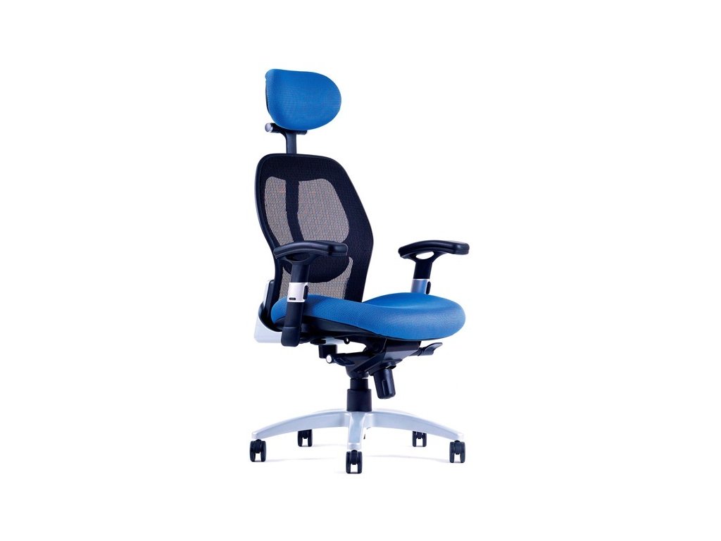 Kvalitní nastavitelná kancelářská židle s ergonomicky tvarovaným vysokým siťovaným opěrákem a opěrkou hlavy. Nastavit můžete výšku sedáku, bederní opěrku, opěrku hlavy, nebo sílu protiváhy své hmotnosti přesně podle svých potřeb. Kolečka jsou vhodná na koberec i tvrdou podlahu. Na opěráku a sedáku je modrý látkový potah.