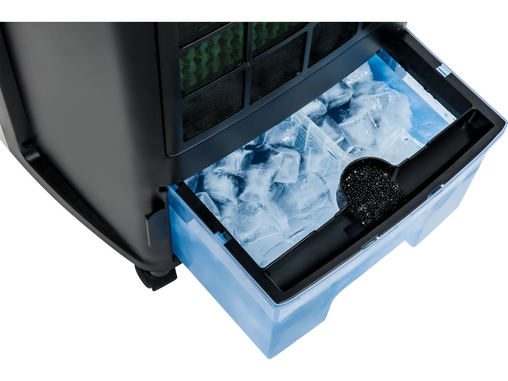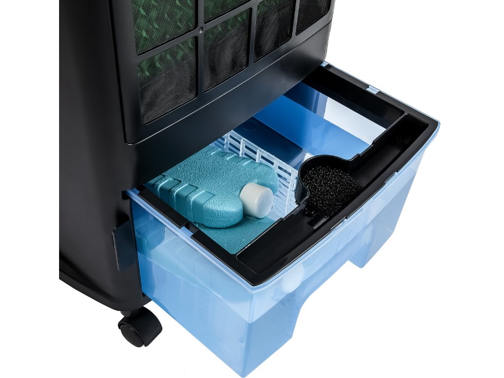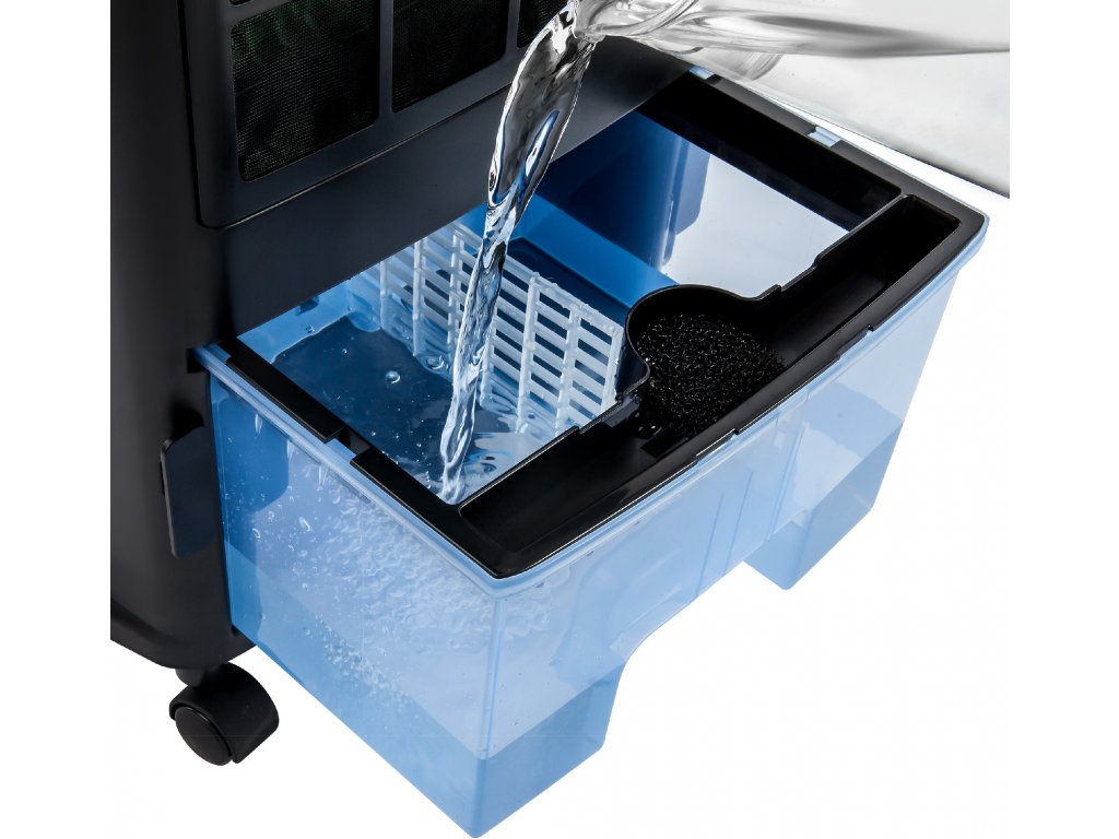 Praktický a moderní ochlazovač vzduchu se stane vaší nejlepší podporou především v horkých dnech. Díky několika funkcím ho můžete využít nejen jako ochlazovač, ale také zvlhčovač vzduchu nebo letní ventilátor. Přístroj je vybaven třemi rychlostmi, třemi provozními módy a časovačem s automatickým vypnutím. Jedinečný design je nejen příjemný na pohled, ale díky kolečkům a postranním madlům i vysoce praktický. Zařízení je doplněno o dálkové ovládání a LED displej s modrým podsvícením.