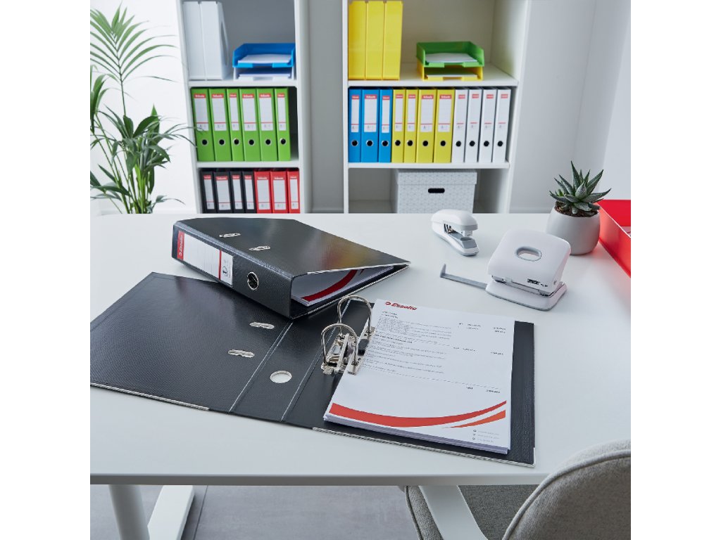 Celoplastový pákový pořadač v černé barvě VIVIDA. Hřberní otvor usnadňuje vytahování z police a celkovou manipulaci. Rado kroužky drží pořadač pevně zavřený a brání jeho nechtěnému oteveřní. Kovolé lišty na spodních lemech chrání pořadač proti poškození. Patentovaná silná páková mechanika Esselte NO.1, záruka na mechaniku 3roky. Nechybí průhledná kapsa an hřbetu s popisným štítkem pro označení.Doplňkové parametry