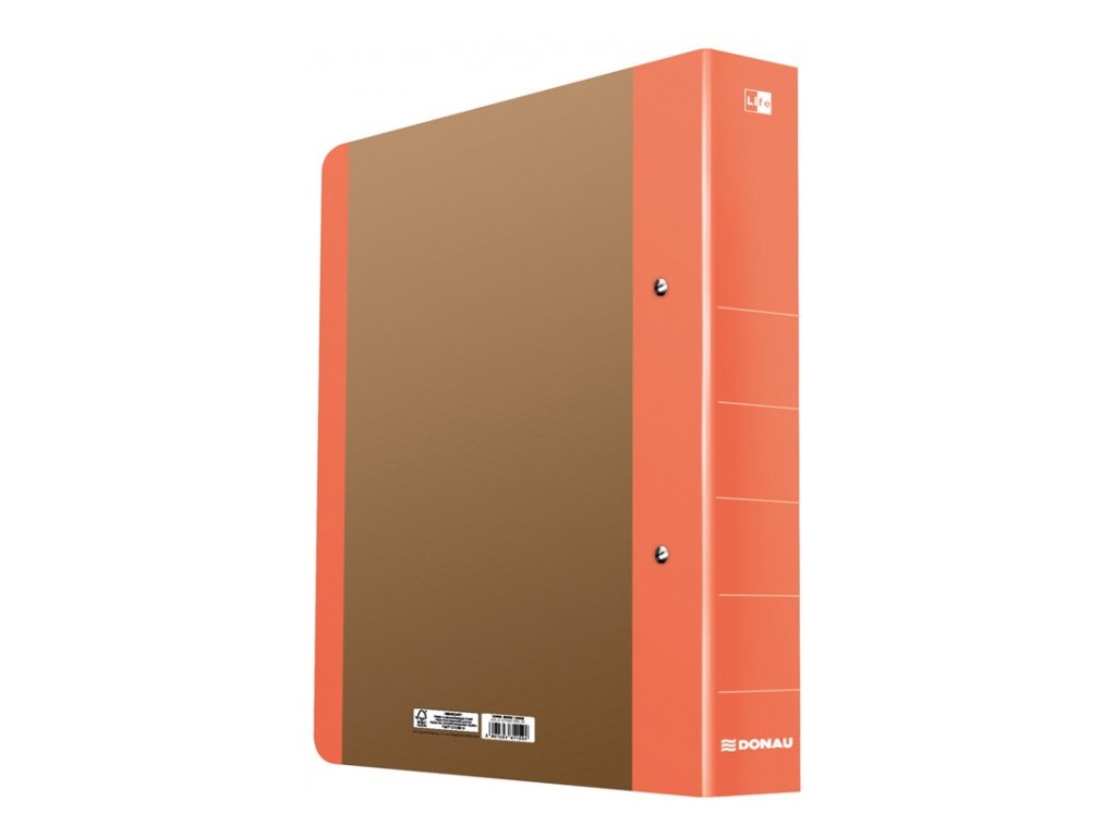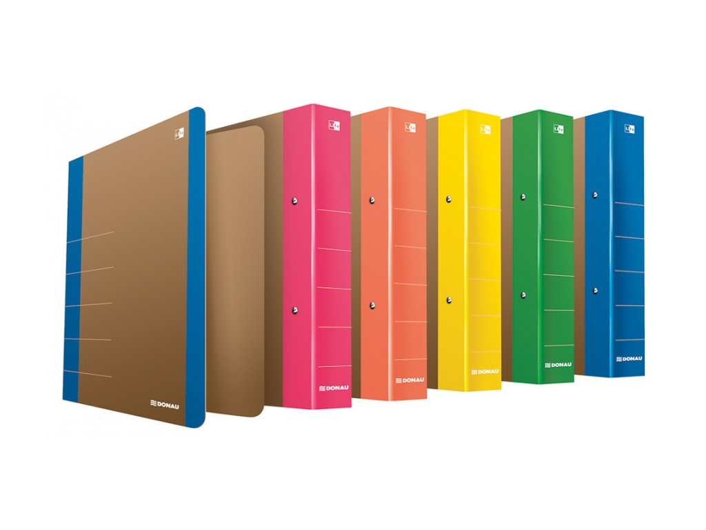 Moderní kroužkový pořadač se zaoblenými rohy, určený pro dokumenty formátu A4+. Desky z pevného kartonu v hnědé barvě s neonovými detaily.Doplňkové parametry