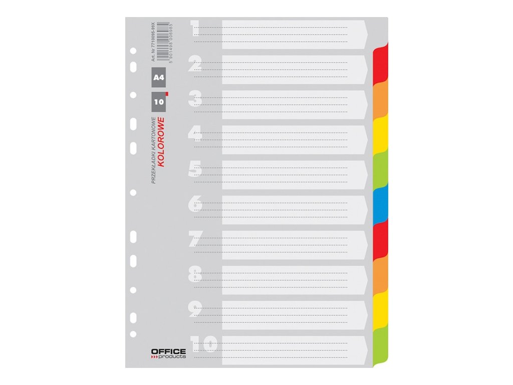 Kartonový rozlišovač A4 vyrobeny z kartonu (170 g/m2). Celkem 10 barevných listů s číslováním od 1 do 10, navíc první strana - obsah v šedém zabarvení.Doplňkové parametry