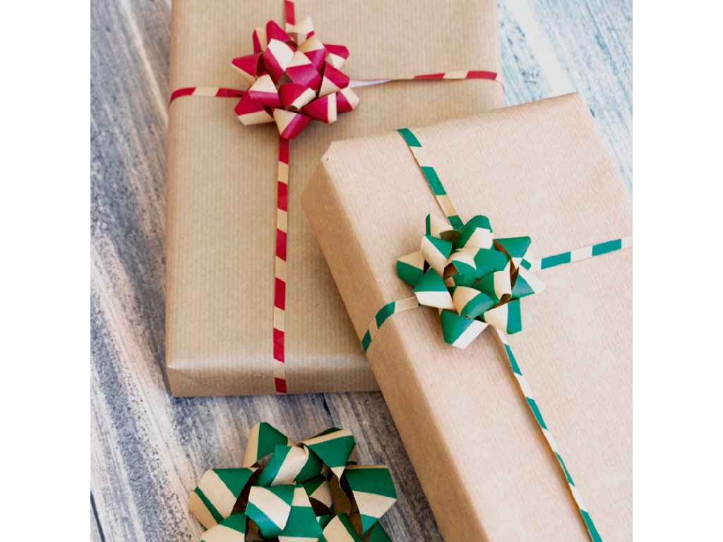 Dekorační sada z kraftového papíru, obsahuje dvě velikosti samolepicích hvězd a balící stuhu. Mix barev bílé, zelené a červené se skvěle doplňuje s přírodní barvou papíru. Udržitelný výrobek. Minimalistický a elegantní nádech pro jedinečný a osobní dárek.