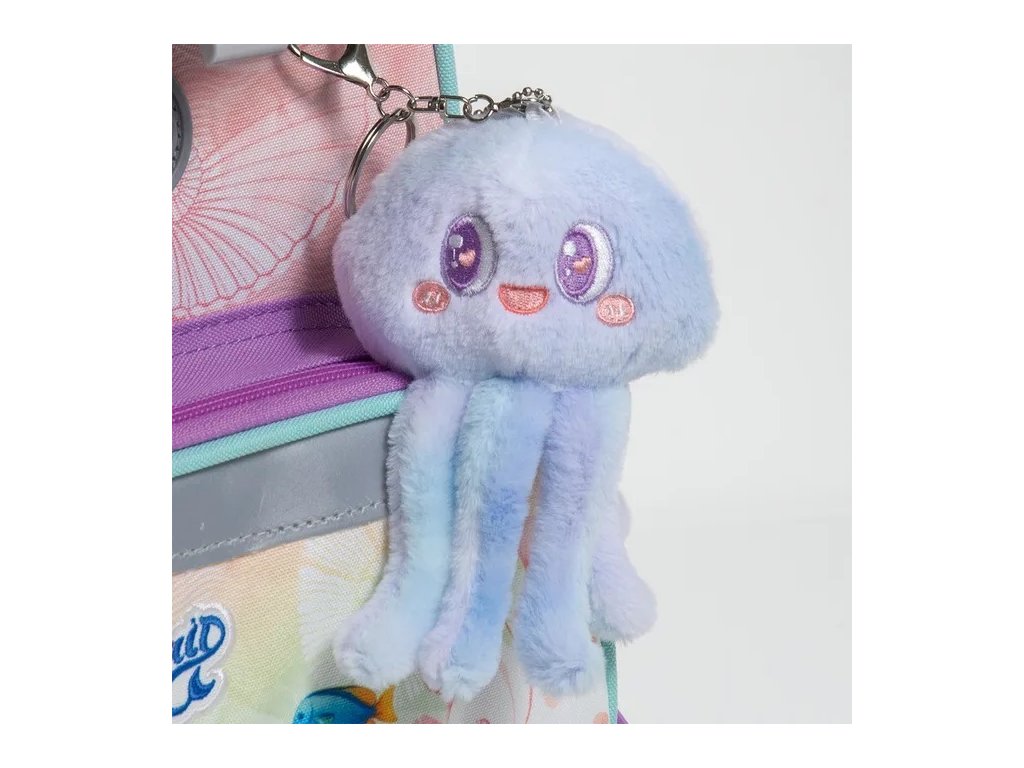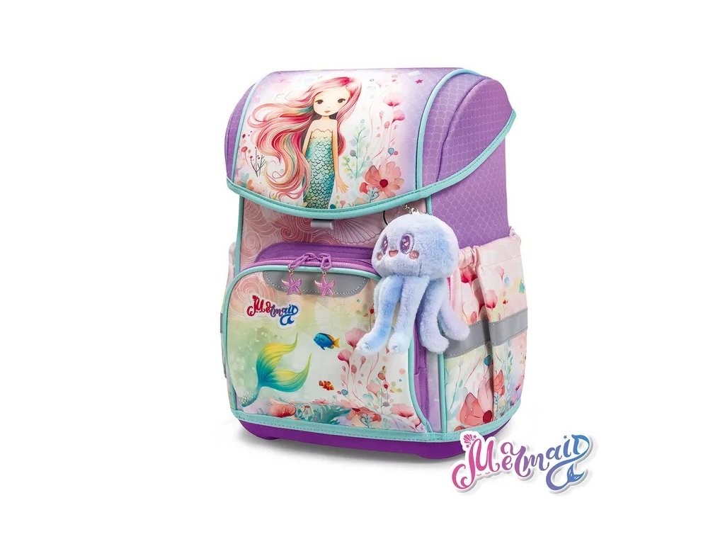 Anatomická školní aktovka MERMAID - mořská panna vyznačující se těmito top vlastnostmi: 3D ergonomický design zádového dílu aktovky pro správné rozložení hmotnosti s vysoce kvalitní síťovinou s měkkým polstrováním, pevný tvar vyztužený po celé výšce, šířce a hloubce aktovky se zapínáním horní pevné klopy je na magnet s pojistným uzávěrem, nastavitelné, ergonomicky tvarované ramenní popruhy a regulovatelný hrudní popruh s praktickým magnetickým zapínáním, hlavní prostor s další úložnou přihrádkou zpevněný s gumou po bocích pro přizpůsobení se obsahu, vhodný do formátu A4, zpevněné plastové dno s nožičkami proti oděru, polyesterová textilie nejvyšší kvality a kvalitní zipy, reflexní bezpečnostní prvky vpředu, vzadu a na bocích, rozšiřitelné boční kapsy s pevnou gumičkou po celé šíři kapsy, přední kapsa na svačinu nebo na penál s izolační fólií zevnitř vnější kapsy, oboustranné zapínání na zip, přívěsek na aktovce - plyšová fialovo-modrá chobotnice s kroužkem na klíče a karabinou, rozvrh hodin a jmenovka uvnitř aktovky, objem 25 litrů