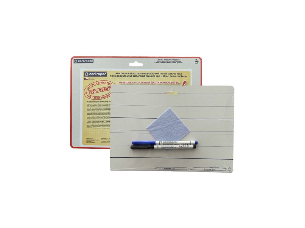 Oboustranně stíratelná tabulka A4 pro 1.třídu. Má potisk linek a podlinek k nácviku pro první psaní. Sada obsahuje stírací textilii a 2 značkovače 2507 s ergonomickou úchopovou částí a válcovým hrotem.