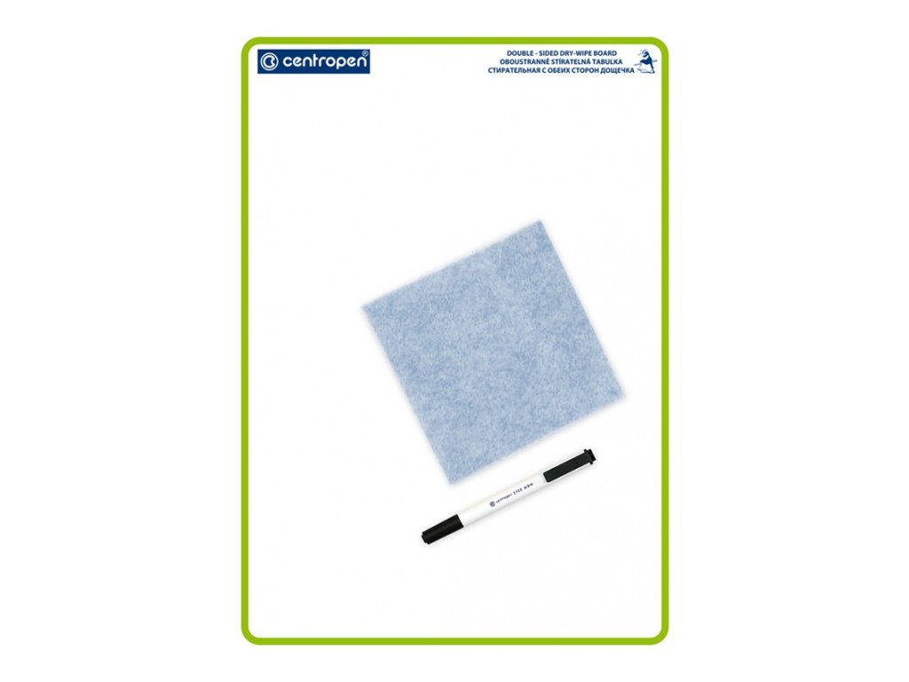 Oboustranně stíratelná tabulka 34x48cm. Určena k nácviku psaní i kreslení. Sada obsahuje stírací textilii a značkovač 2709 s ergonomickou úchopovou částí a válcovým hrotem. Otvor pro zavěšení.
