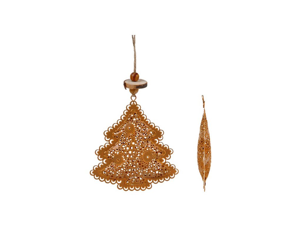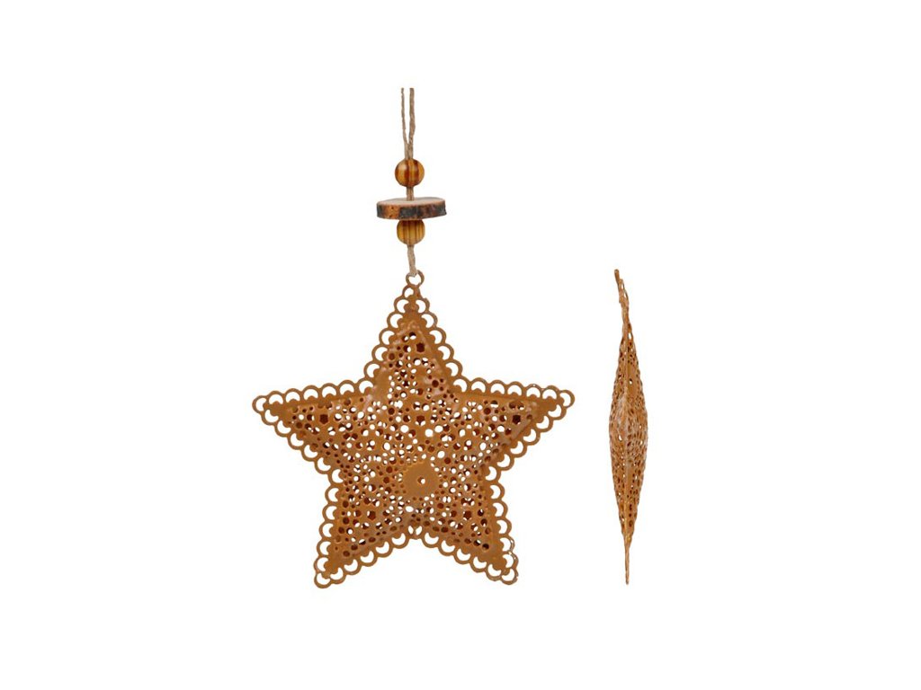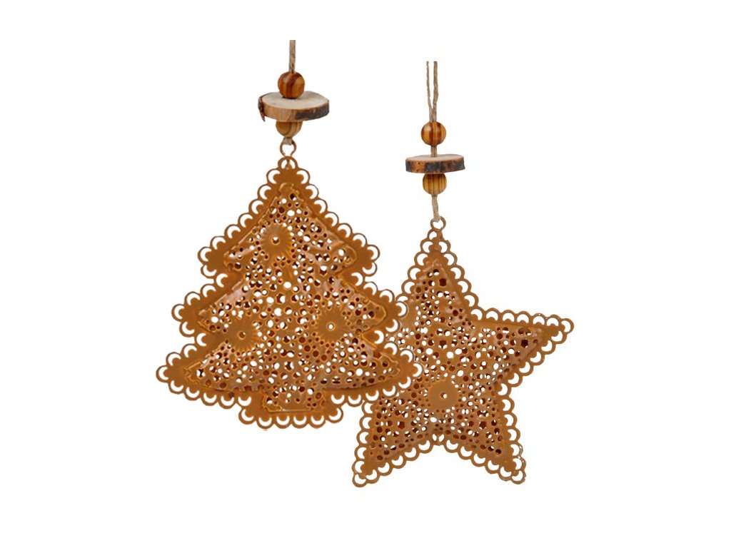 Vánoční plechová dekorace 3D stromek nebo hvězda v hnědé barvě s mini dírkami a závěsem. Tato vánoční ozdoba je opatřena očkem, korálky a provázkem na zavěšení. Můžete použít na ozdobení vánočního stromečku, zavěsit na dveře, okno a zkrášlit tak Vaše bydlení.