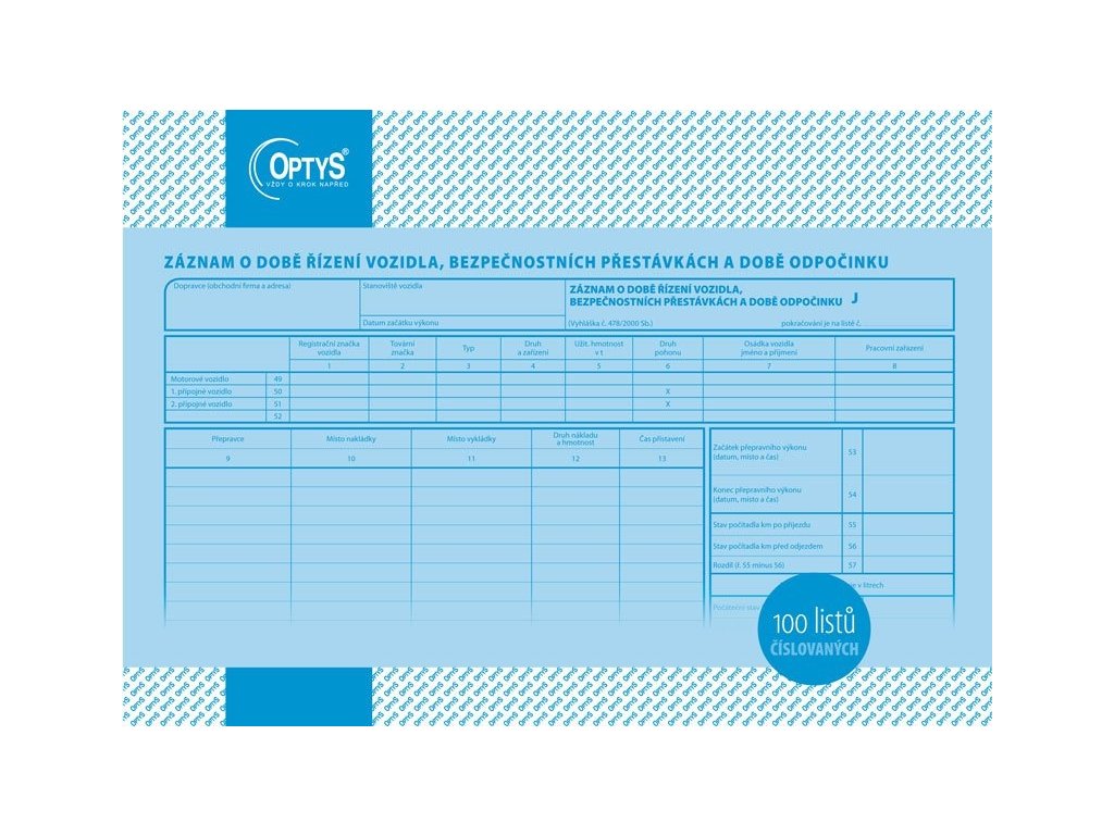 Kompletní záznam o době řízení a bezpečnostních přestávkách, listy odtržitelné perforací, se zakládacím děrováním.