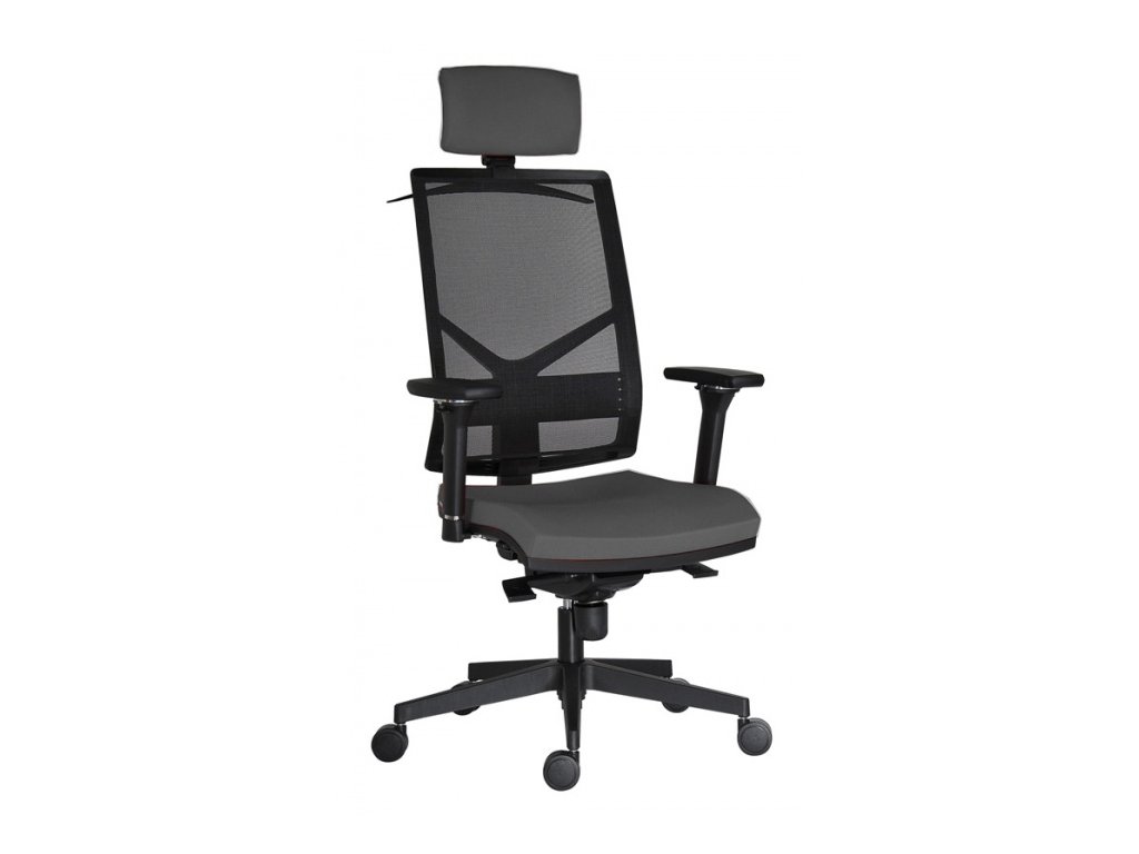 Kvalitní kancelářská židle s černým síťovaným opěrákem a výškově nastavitelnou bederní výstuhou zaručující maximální komfort i při dlouhém sezení. Ergonomicky tvarovaný sedák i opěrka hlavy v tmavě šedé barvě jsou plněny studenou pěnou. synchronní mchansmus umožňuje až pětinásobnou aretaci, nastavení výšky opěráku kterou lze zafixovat. Pevná plastová báze má kolečka o průměru 65mm vhodná na hladkou podlahu i koberec. Židle je bez područek, je však možné j doobjednat. K židli lze dopnit ramínko na zavěšení oděvu.