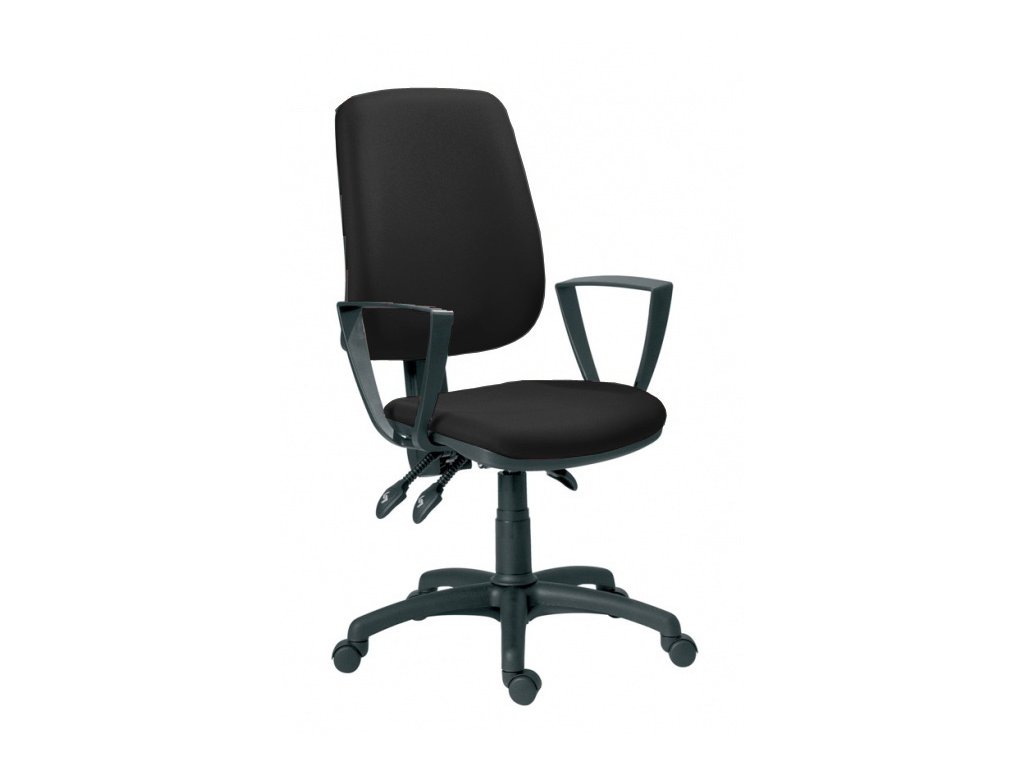 Kancelářská pracovní židle s vysokým, mírně ergonomicky tvarovaným opěrákem. Asynchronní mechanismus umožňuje nezávislé nastavení úhlu sedáku a opěráku. Výška sedáku a opěráku se nastavuje samostatným plynovým pístem - mechanismem up-down. Pevná plastová podnož. Židle je bez područek. Černá barva.