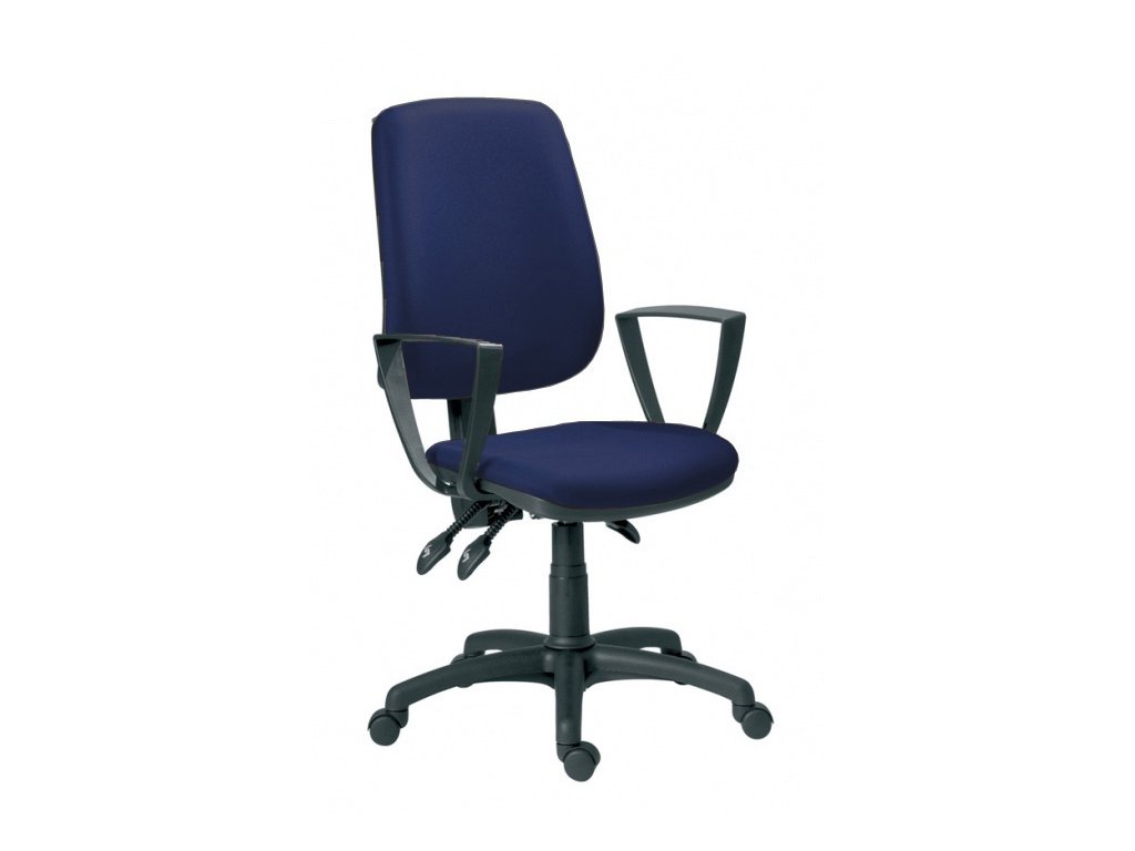 Kancelářská pracovní židle s vysokým, mírně ergonomicky tvarovaným opěrákem. Asynchronní mechanismus umožňuje nezávislé nastavení úhlu sedáku a opěráku. Výška sedáku a opěráku se nastavuje samostatným plynovým pístem - mechanismem up-down. Pevná plastová podnož. Židle je bez područek. Tmavě modrá barva.