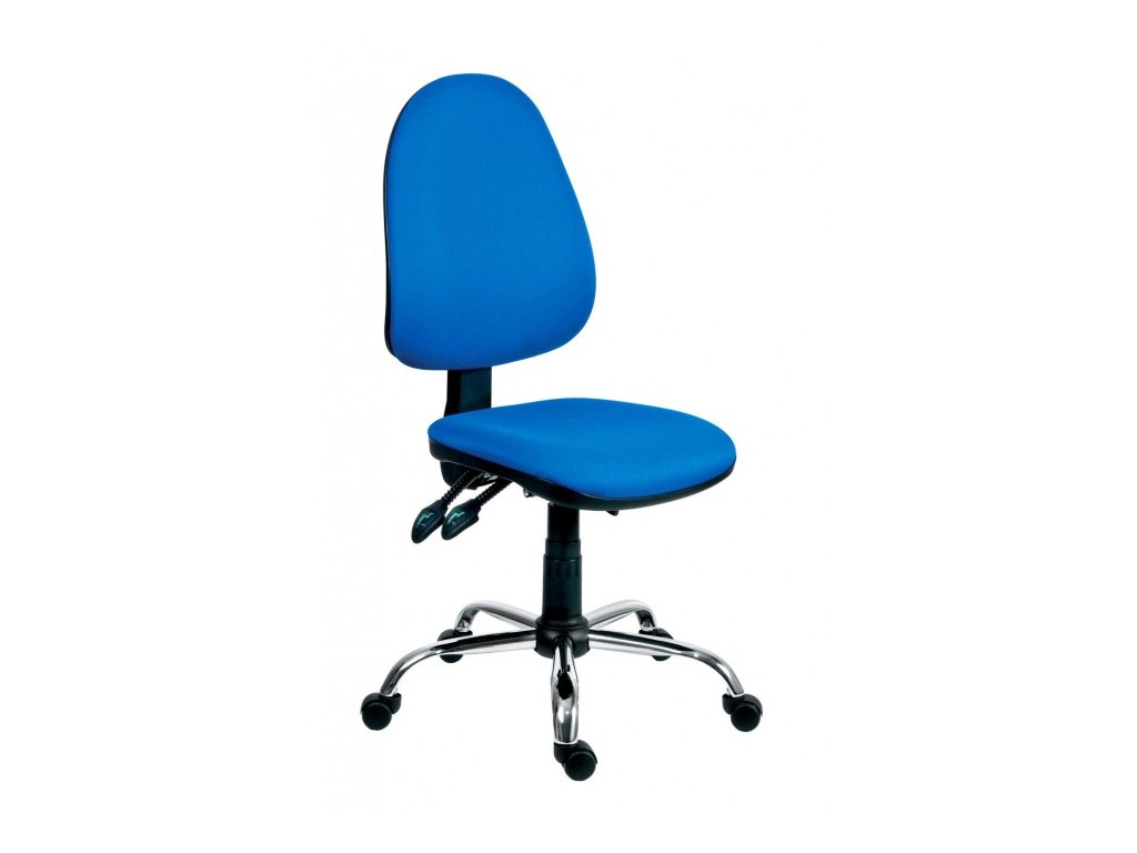 Čalouněná pracovní židle se středně vysokým opěrákem. Asynchronní mechanismus umožňuje nezávislé nastavení úhlu sedáku a opěráku. Výška sedáku a opěráku se nastavuje samostatným plynovým pístem. Moderní design dotváří ocelová chromovaná podnož. Židle je bez područek. Světle modrá barva.
